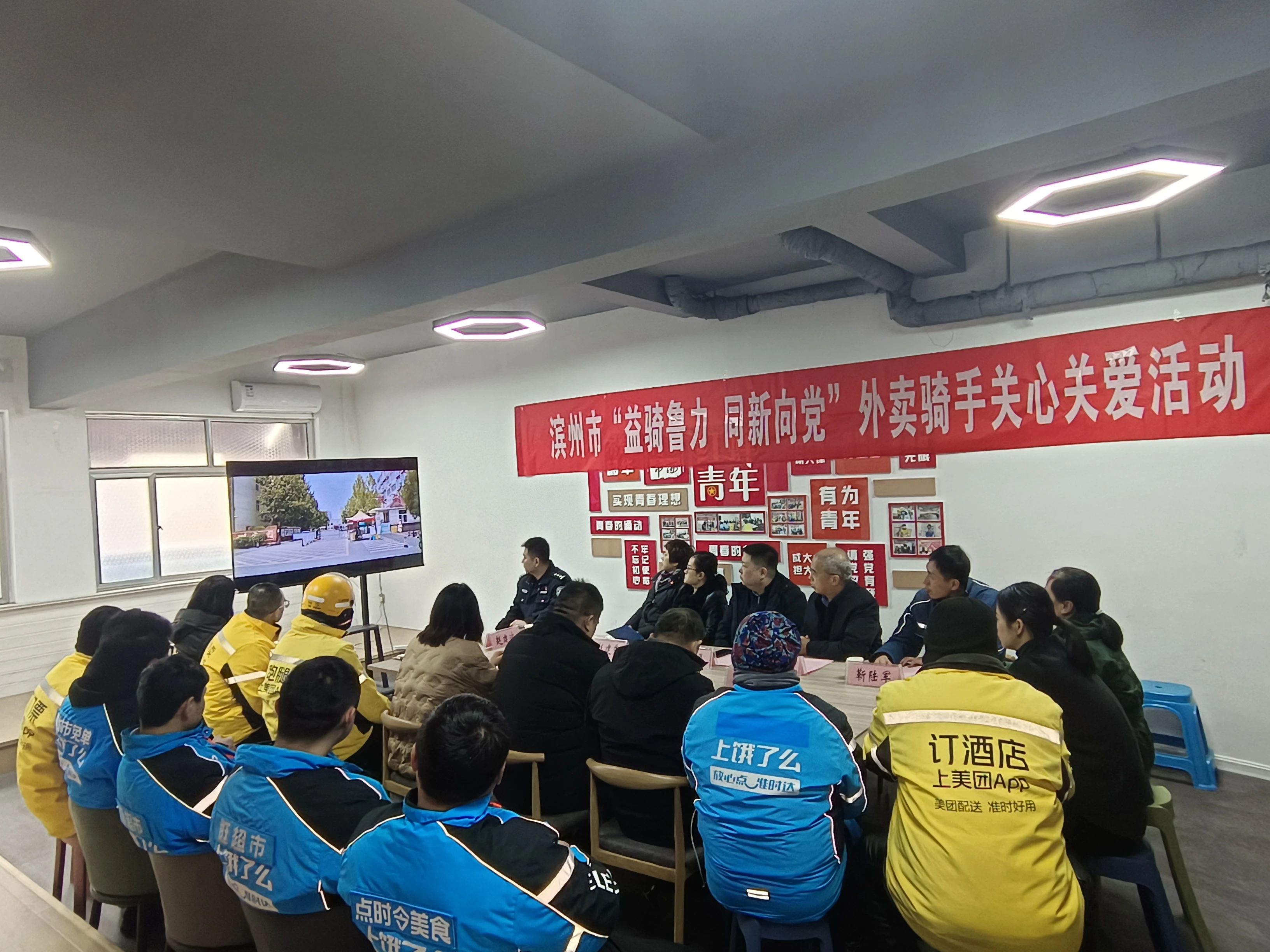 知识伴出行。外卖小哥代表一同观看了“红蜂驿站”外卖行业党建工作宣传片,活动邀请滨城区交警大队事故处理科副科长赵建波同志进行了交通安全知识培训,详细分析事故发生的原因并提出预防措施,提高大家的安全防范意识。