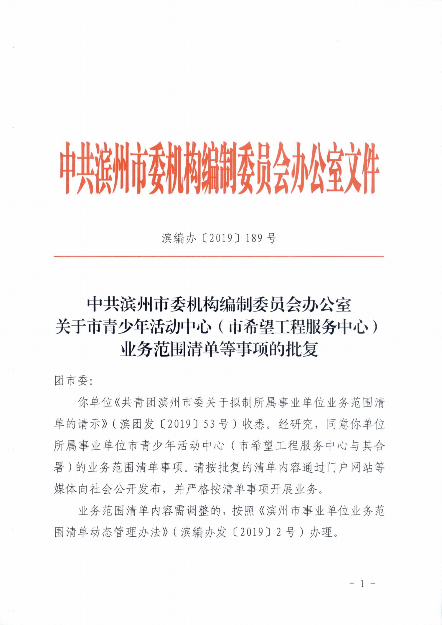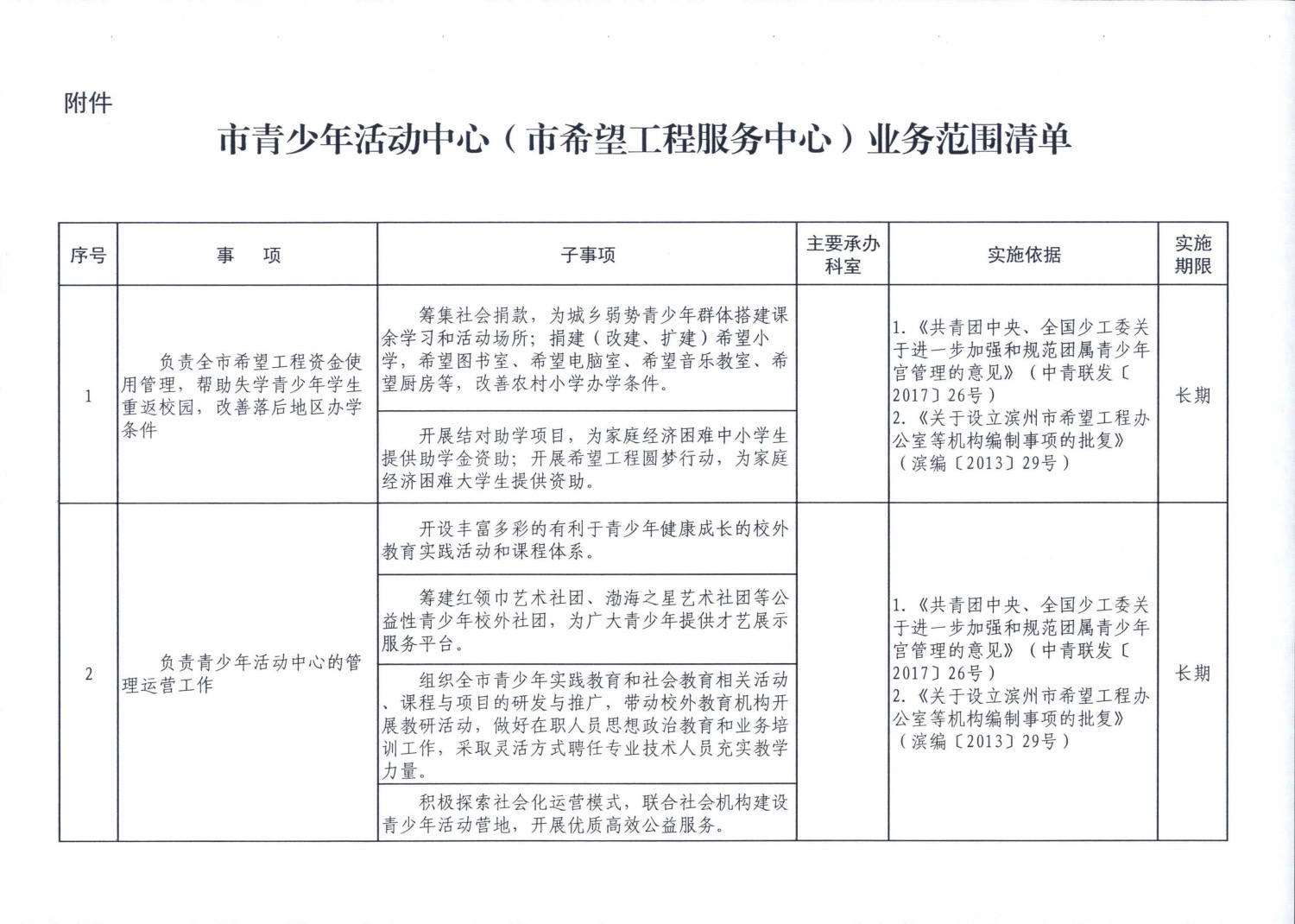 关于市青少年活动中心(市希望工程服务中心)业务范围清单的批复